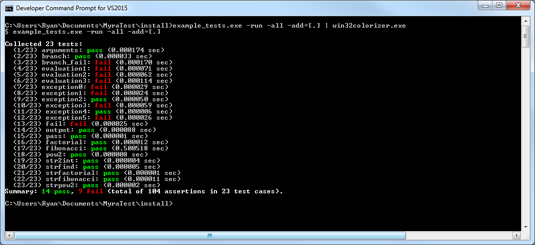 To add visual emphasis to certain items, the MyraTest test runner adds a modest amount of color to its output (green/red for passing/failing tests, blue for hidden tests, etc). It uses standardized ANSI escape sequences (reference), which are understood by the common linux shells (bash, etc), cygwin, and the Windows10 console. Unfortunately the Windows7 console does not understand these codes, it just passes them verbatim to the display (see the ←[31;1m and similar fragments):